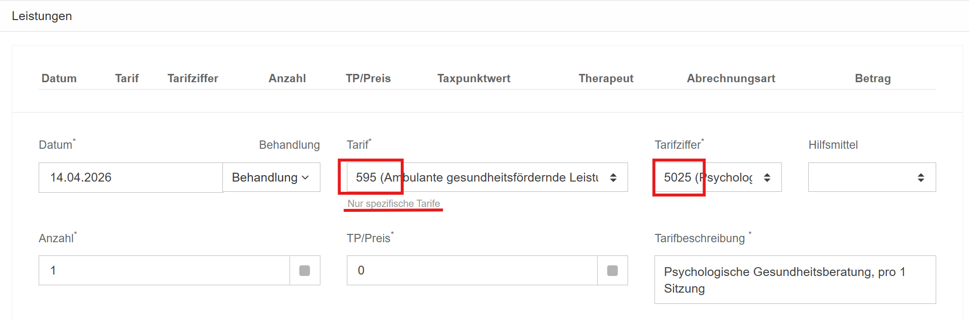 Sobald die Tarifziffern hinterlegt sind, stehen sie Ihnen direkt in der Rechnungsstellung zur Verfügung. Dort können Sie den Tarif 595 auswählen und auf die zuvor definierten Positionen zugreifen.