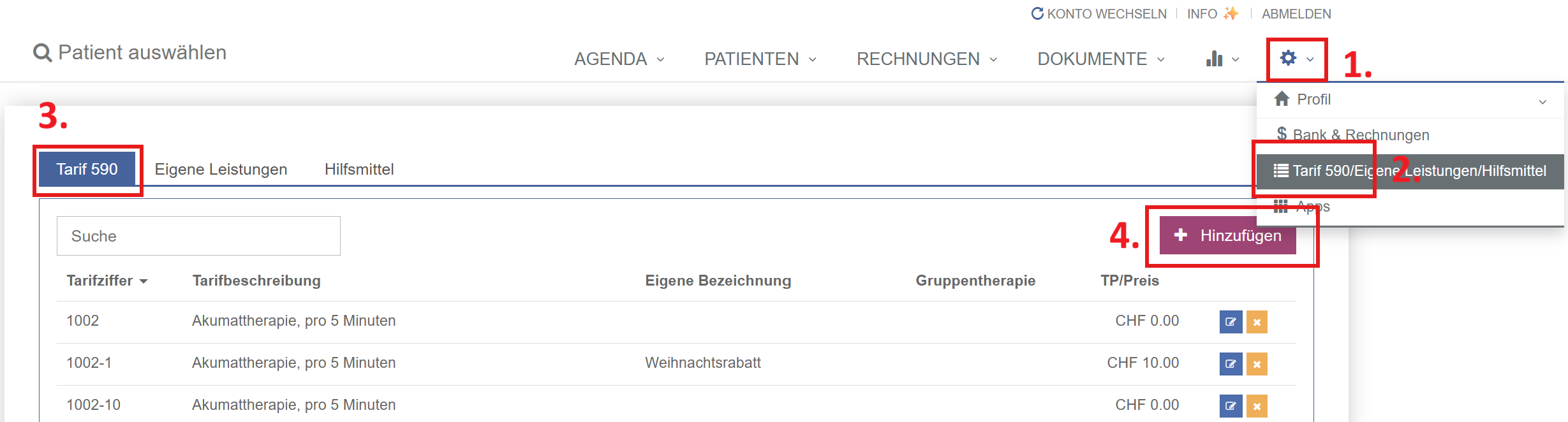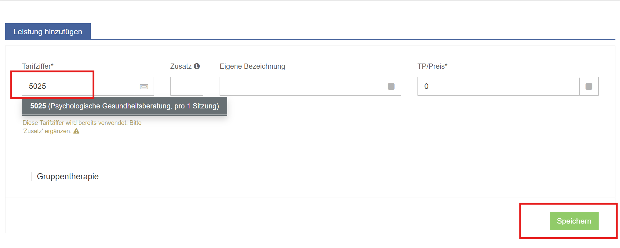 2. Fügen Sie die benötigten Tarifziffern sowie Ihre Preise hinzu